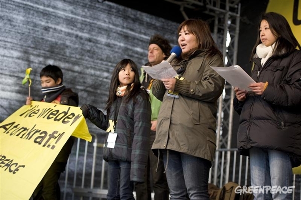 A woman who identified herself as mother is reading an anti-nuclear protest announcement © Michael Loewa / Greenpeace