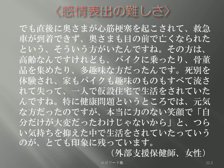 Edit Item 保健師による東日本大震災復興支援プロジェクト エピソード集|<感情表出の難しさ 22-2>