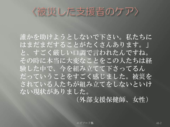 Edit Item 保健師による東日本大震災復興支援プロジェクト エピソード集|<精神面への影響 42-1>
