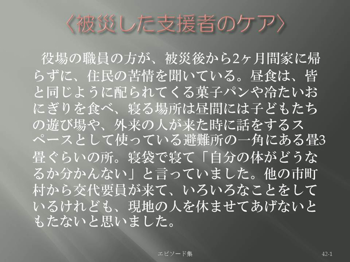 Edit Item 保健師による東日本大震災復興支援プロジェクト エピソード集|<精神面への影響 42-2>