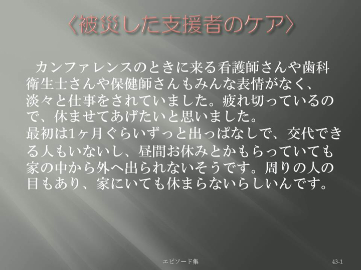 Edit Item 保健師による東日本大震災復興支援プロジェクト エピソード集|<精神面への影響 43-1>