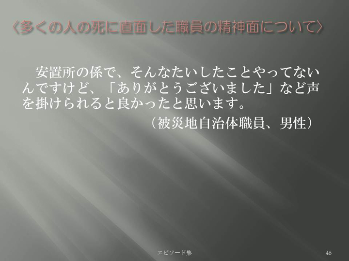 Edit Item 保健師による東日本大震災復興支援プロジェクト エピソード集|<精神面への影響 46>