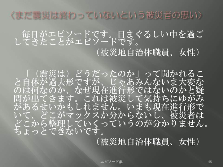 Edit Item 保健師による東日本大震災復興支援プロジェクト エピソード集|<震災は終わっていないという被災者の思い 48>