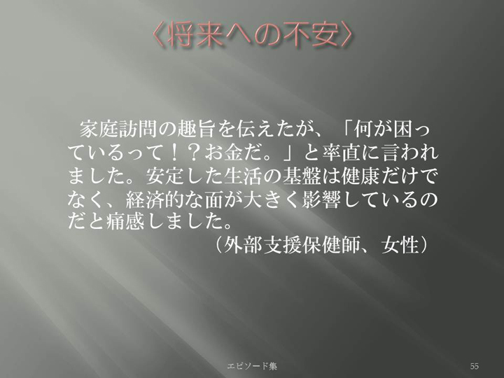 Edit Item 保健師による東日本大震災復興支援プロジェクト エピソード集|<将来への不安 55>
