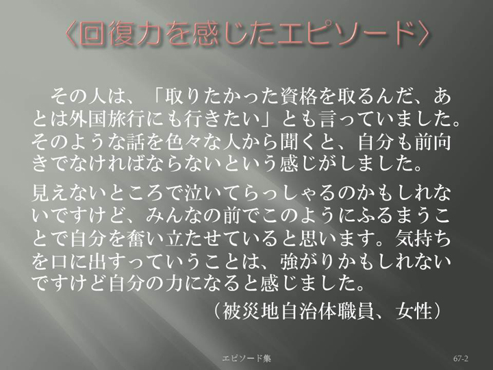 Edit Item 保健師による東日本大震災復興支援プロジェクト エピソード集|<回復力を感じたエピソード 67-2>
