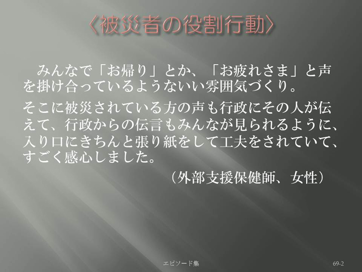 Edit Item 保健師による東日本大震災復興支援プロジェクト エピソード集|<回復力を感じたエピソード 69-2>