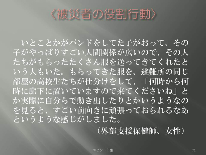 Edit Item 保健師による東日本大震災復興支援プロジェクト エピソード集|<被災者の役割行動 71>
