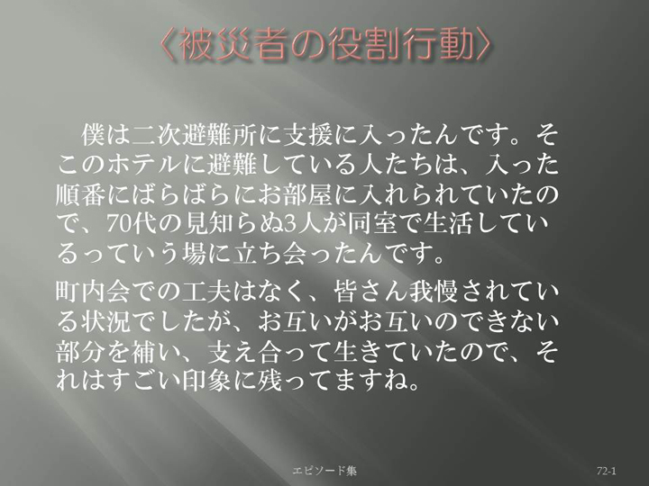 Edit Item 保健師による東日本大震災復興支援プロジェクト エピソード集|<被災者の役割行動 72-1>
