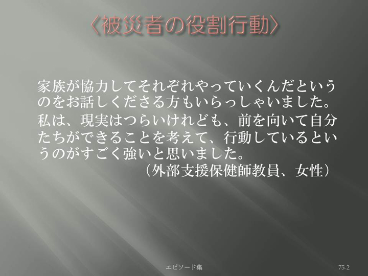 Edit Item 保健師による東日本大震災復興支援プロジェクト エピソード集|<被災者の役割行動 75-2>
