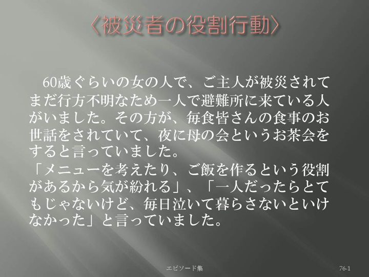 Edit Item 保健師による東日本大震災復興支援プロジェクト エピソード集|<被災者の役割行動 76-1>