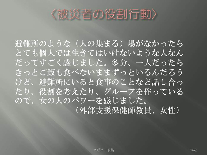 Edit Item 保健師による東日本大震災復興支援プロジェクト エピソード集|<被災者の役割行動 76-2>