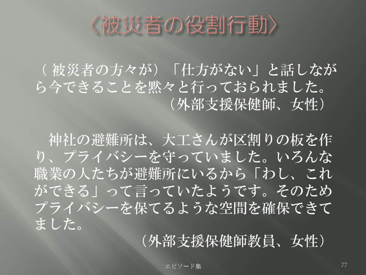 Edit Item 保健師による東日本大震災復興支援プロジェクト エピソード集|<被災者の役割行動 77>
