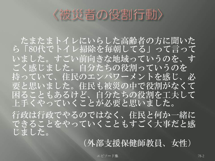 Edit Item 保健師による東日本大震災復興支援プロジェクト エピソード集|<被災者の役割行動 78-2>