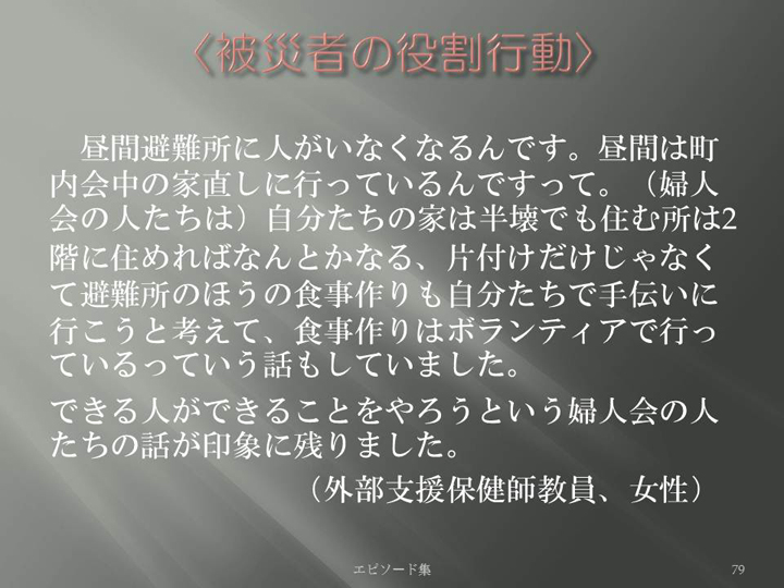 Edit Item 保健師による東日本大震災復興支援プロジェクト エピソード集|<被災者の役割行動 79>