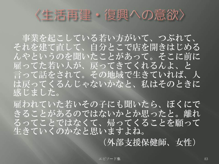 Edit Item 保健師による東日本大震災復興支援プロジェクト エピソード集|<生活再建・復興への意欲 83>