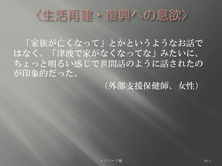 Edit Item 保健師による東日本大震災復興支援プロジェクト エピソード集|<生活再建・復興への意欲 86-2>