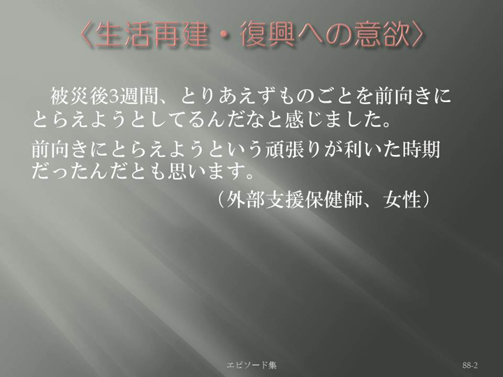 Edit Item 保健師による東日本大震災復興支援プロジェクト エピソード集|<生活再建・復興への意欲 88-2>