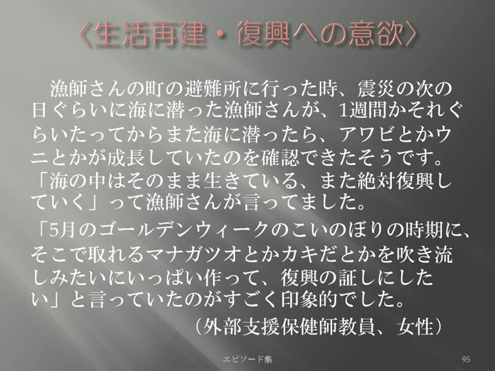 Edit Item 保健師による東日本大震災復興支援プロジェクト エピソード集|<生活再建・復興への意欲 95>
