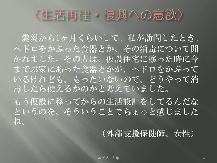 Edit Item 保健師による東日本大震災復興支援プロジェクト エピソード集|<生活再建・復興への意欲 96>