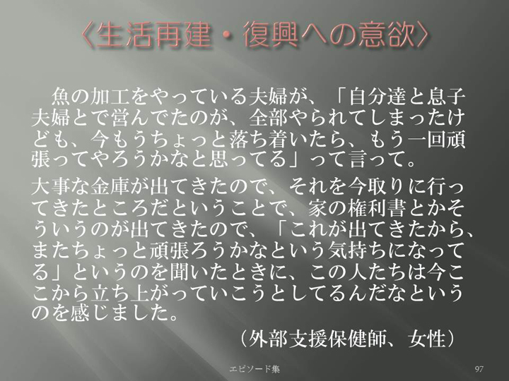 Edit Item 保健師による東日本大震災復興支援プロジェクト エピソード集|<生活再建・復興への意欲 97>