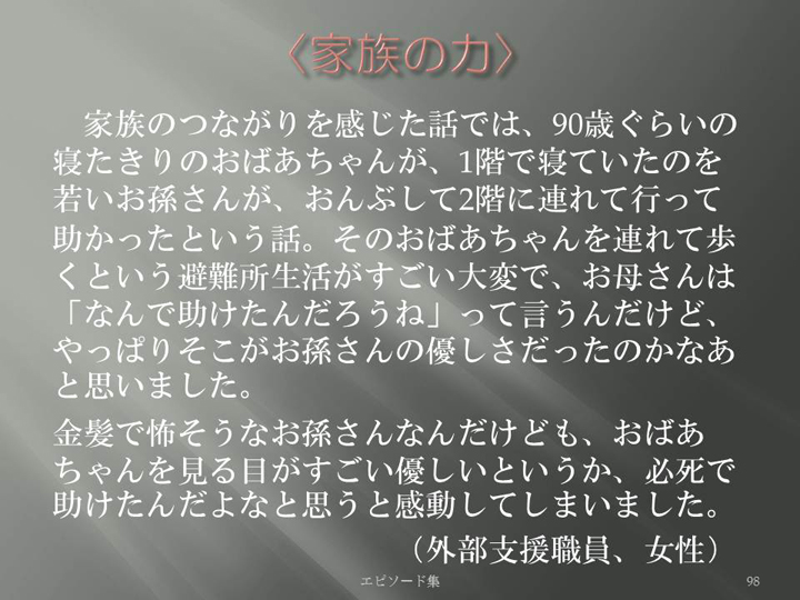 Edit Item 保健師による東日本大震災復興支援プロジェクト エピソード集|<家族の力 98>