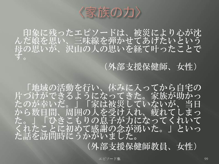 Edit Item 保健師による東日本大震災復興支援プロジェクト エピソード集|<家族の力 99>