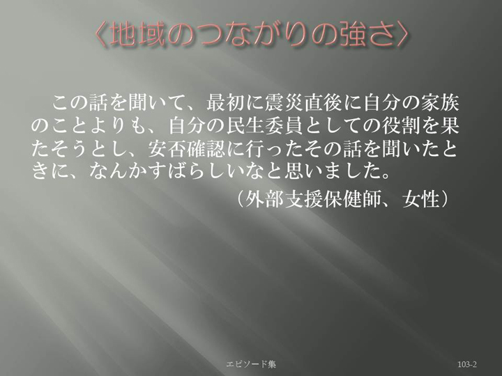 Edit Item 保健師による東日本大震災復興支援プロジェクト エピソード集|<地域のつながりの強さ 103-2>