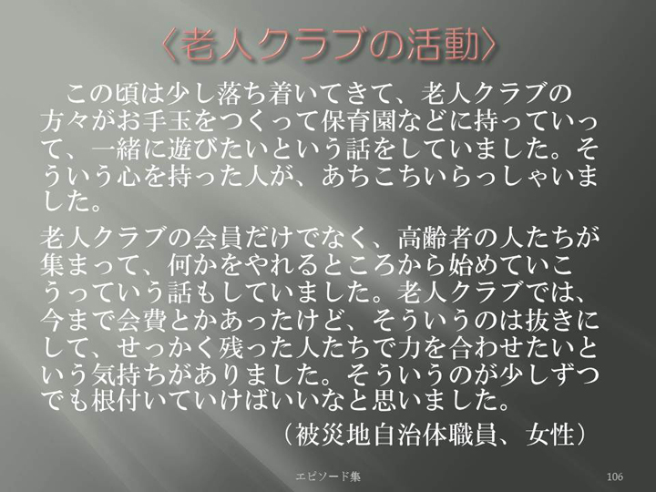 Edit Item 保健師による東日本大震災復興支援プロジェクト エピソード集|<老人クラブの活動 106>