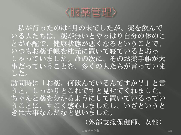 Edit Item 保健師による東日本大震災復興支援プロジェクト エピソード集|<服薬管理 108>