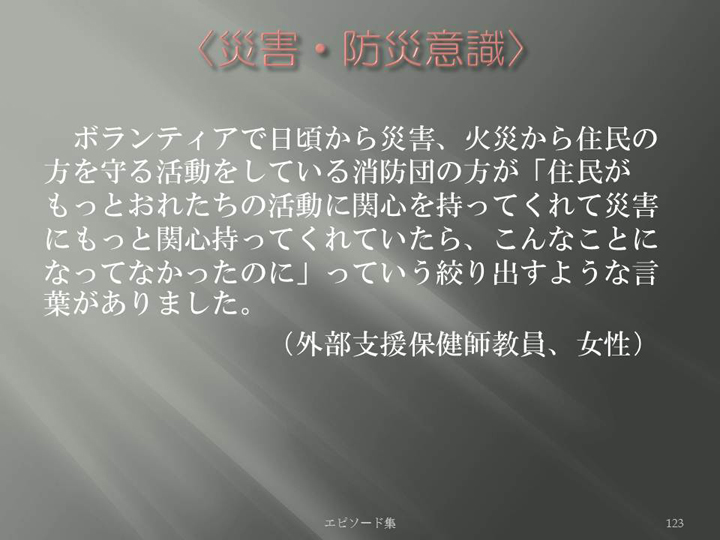 Edit Item 保健師による東日本大震災復興支援プロジェクト エピソード集|<災害・防災意識 123>