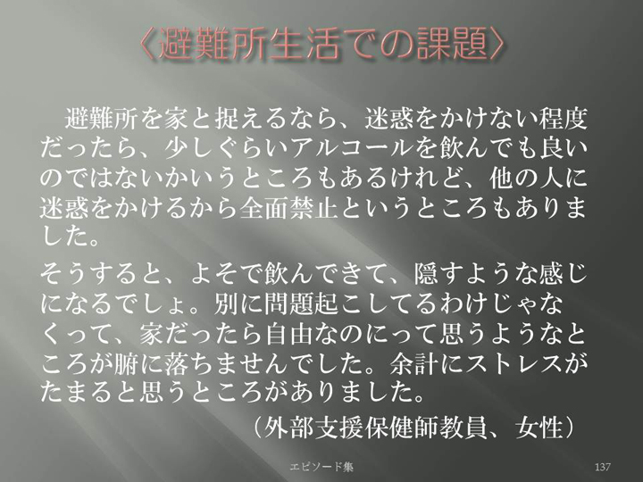 Edit Item 保健師による東日本大震災復興支援プロジェクト エピソード集|<避難所生活での課題 137>