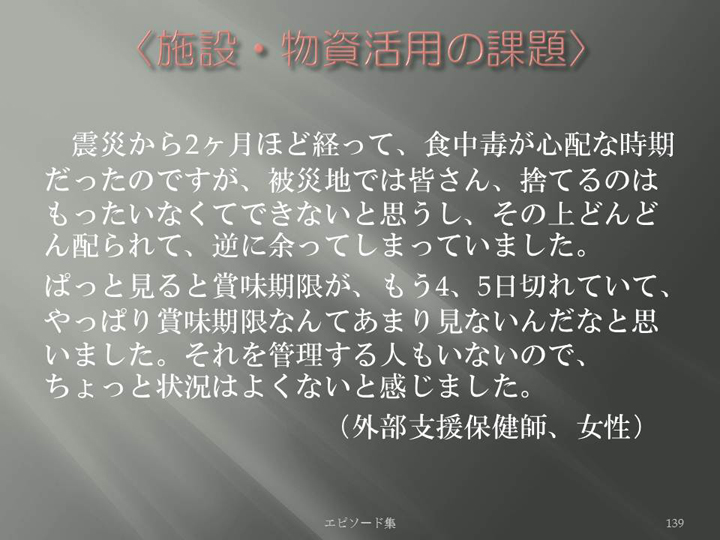 Edit Item 保健師による東日本大震災復興支援プロジェクト エピソード集|<施設・物資活用の課題 139>