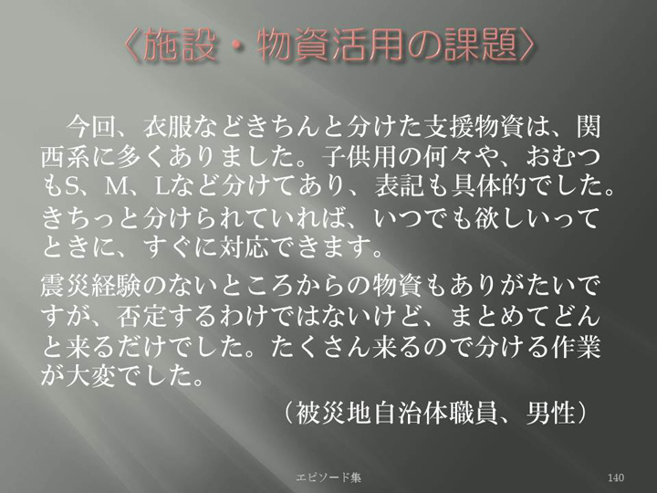 Edit Item 保健師による東日本大震災復興支援プロジェクト エピソード集|<施設・物資活用の課題 140>