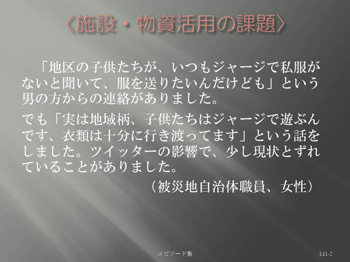 Edit Item 保健師による東日本大震災復興支援プロジェクト エピソード集|<施設・物資活用の課題 141-2>