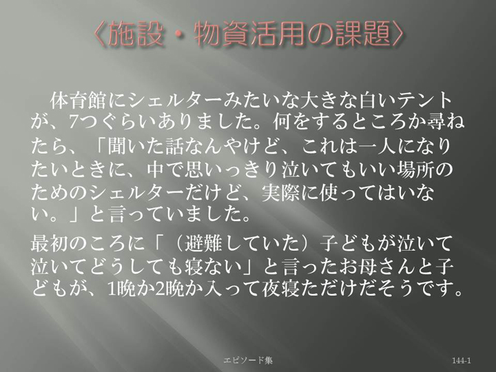 Edit Item 保健師による東日本大震災復興支援プロジェクト エピソード集|<施設・物資活用の課題 144-1>