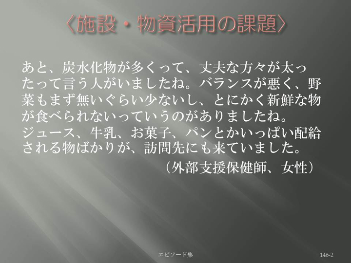 Edit Item 保健師による東日本大震災復興支援プロジェクト エピソード集|<施設・物資活用の課題 146-2>