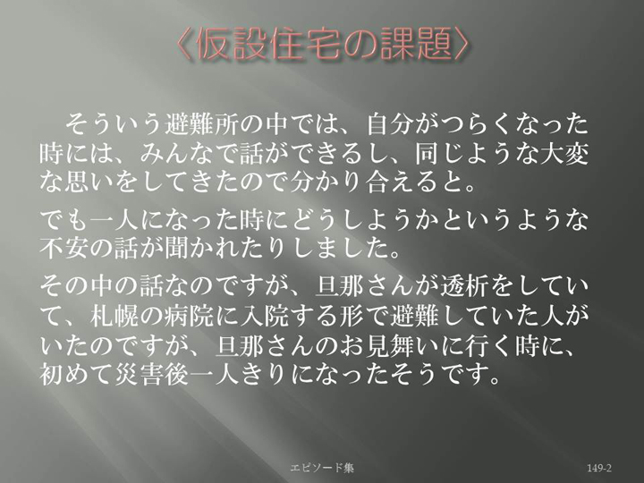 Edit Item 保健師による東日本大震災復興支援プロジェクト エピソード集|<仮設住宅の課題 149-2>