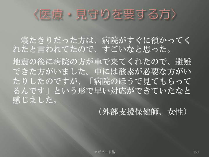 Edit Item 保健師による東日本大震災復興支援プロジェクト エピソード集|<医療・見守りを要する方 150>