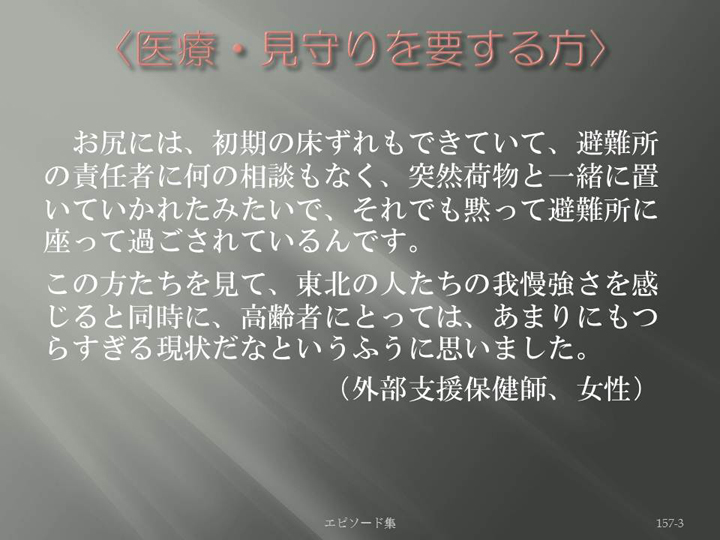 Edit Item 保健師による東日本大震災復興支援プロジェクト エピソード集|<医療・見守りを要する方 157-3>
