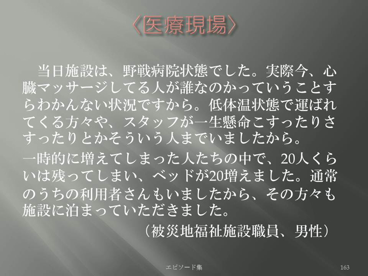 Edit Item 保健師による東日本大震災復興支援プロジェクト エピソード集|<医療現場 163>