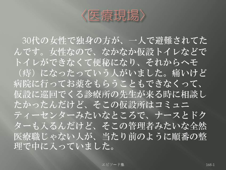 Edit Item 保健師による東日本大震災復興支援プロジェクト エピソード集|<医療現場 168-1>