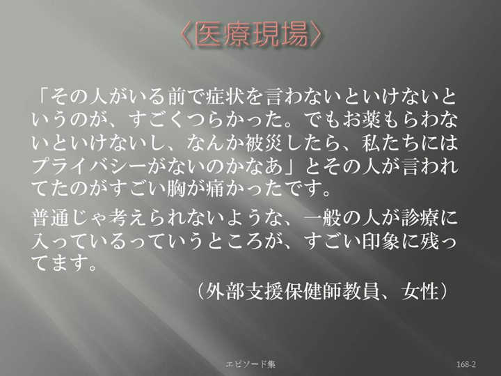 Edit Item 保健師による東日本大震災復興支援プロジェクト エピソード集|<医療現場 168-2>