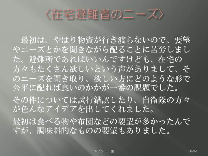 Edit Item 保健師による東日本大震災復興支援プロジェクト エピソード集|<在宅避難者のニーズ 169-1>