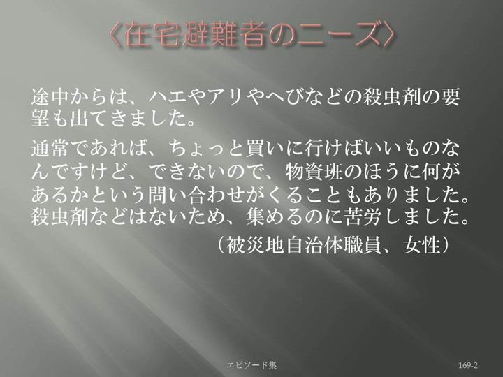 Edit Item 保健師による東日本大震災復興支援プロジェクト エピソード集|<在宅避難者のニーズ 169-2>