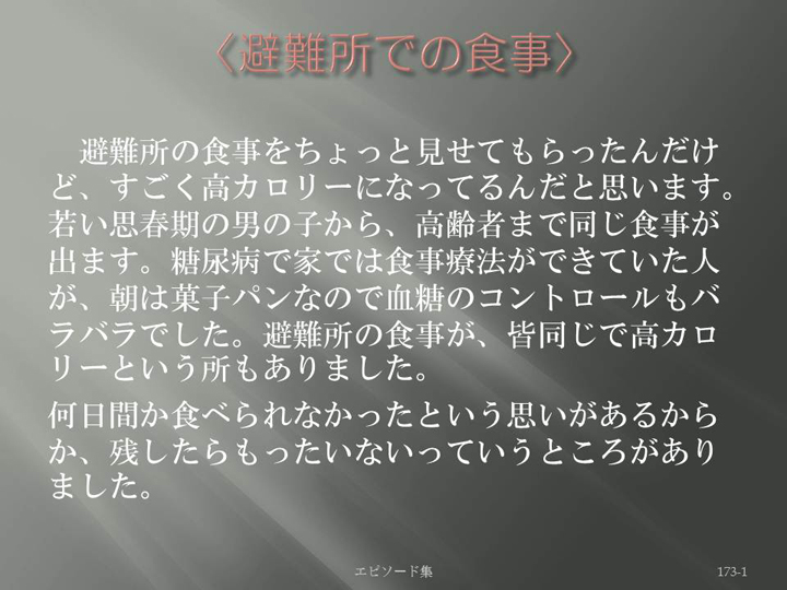 Edit Item 保健師による東日本大震災復興支援プロジェクト エピソード集|<避難所での食事 173-1>
