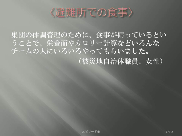 Edit Item 保健師による東日本大震災復興支援プロジェクト エピソード集|<避難所での食事 174-2>