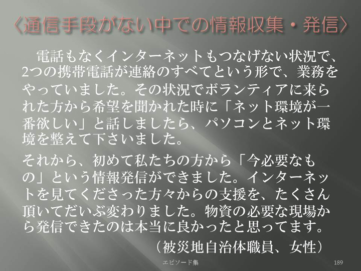 Edit Item 保健師による東日本大震災復興支援プロジェクト エピソード集|<通信手段がない中での情報収集・発信 189>