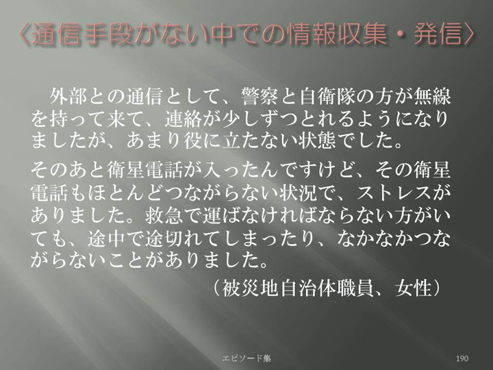 Edit Item 保健師による東日本大震災復興支援プロジェクト エピソード集|<通信手段がない中での情報収集・発信 190>