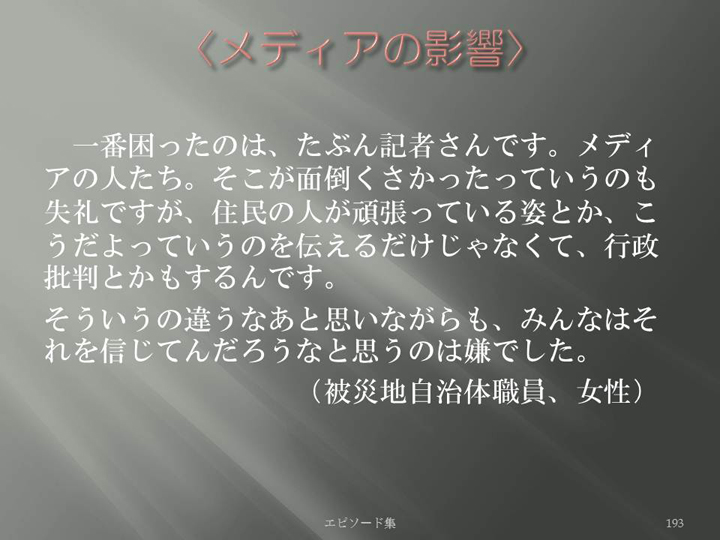 Edit Item 保健師による東日本大震災復興支援プロジェクト エピソード集|<メディアの影響 193>