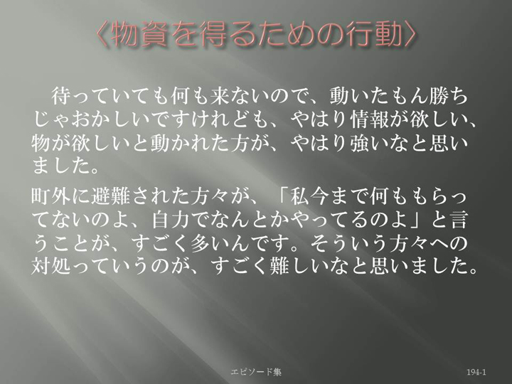 Edit Item 保健師による東日本大震災復興支援プロジェクト エピソード集|<物資を得るための行動 194-1>